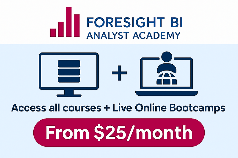 BundleGet unlimited access to all Foresight BI courses plus live online bootcamps. Learn Power BI, Excel, SQL, and Data Visualization with expert guidance. Practical, affordable, and flexible for your career growth.